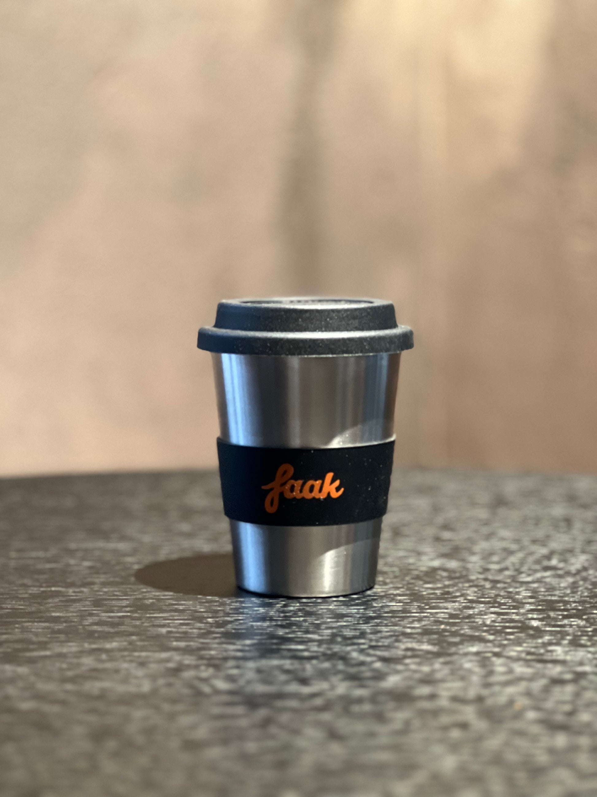 Travel Mug FAAK in acciaio inox con coperchio salvagoccia e morbida fascia in silicone antiscottatura ideale per goderti dove vuoi la tua bevanda calda.